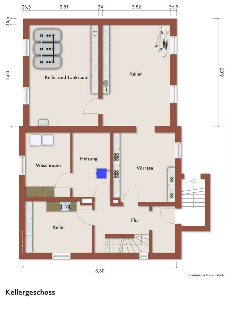 Zur Immobilie gehören zudem eine Garage und ein Außenstellplatz, die Ihnen praktischen Stauraum und zusätzliche Parkmöglichkeiten bieten. Der Keller bietet weiteren Platz für Lagerung und Nutzungsmöglichkeiten.