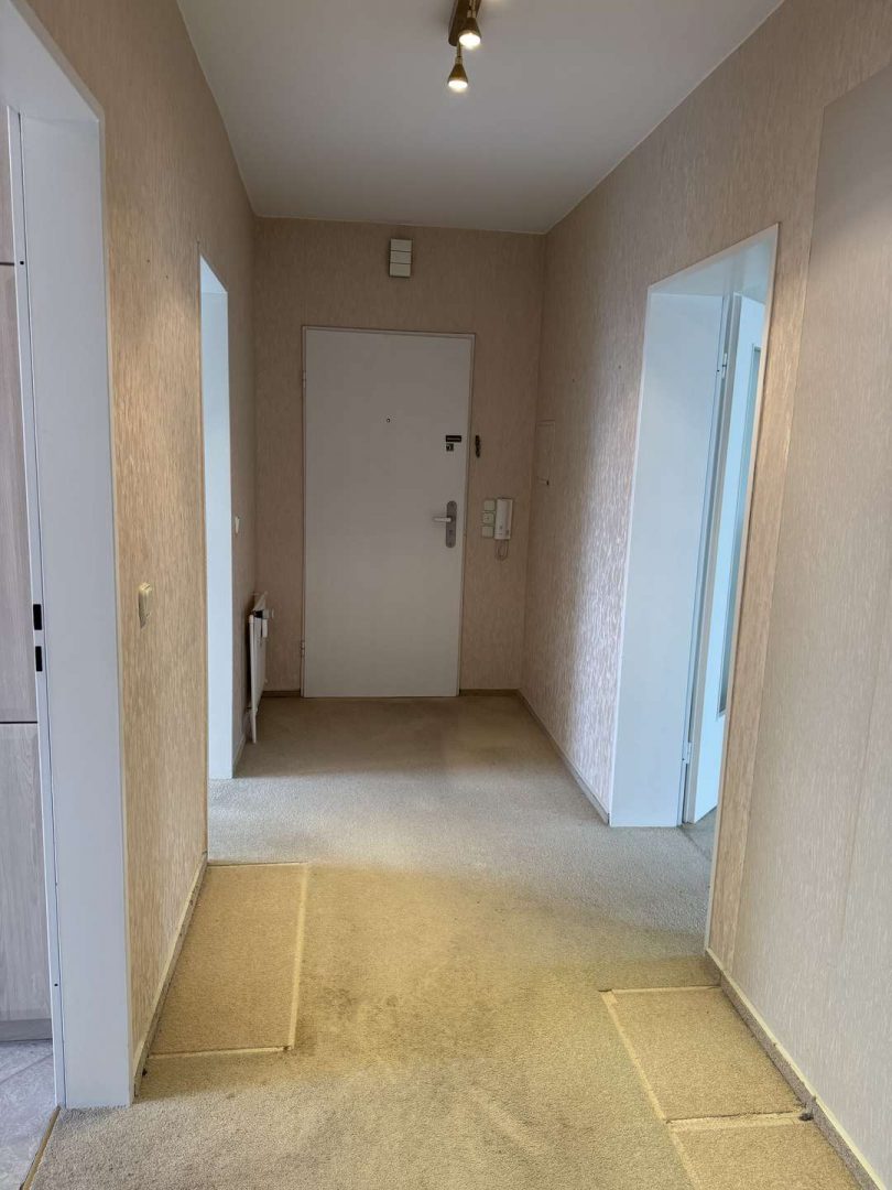 - Alter Bodenbelag aus Teppichboden in den Wohn-/Schlafbereichen, moderne Fliesen in Küche und Bad