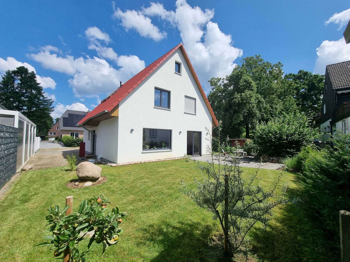 Entdecken Sie Ihr Traumhaus in Hamburg-Rahlstedt! Dieses neuwertige Einfamilienhaus bietet gehobenen Wohnkomfort auf 140 m² Wohnfläche, verteilt auf 4-5 Zimmer, mit zusätzlicher Ausbaureserve im Dachgeschoss. Das großzügige ideell geteilte Grundstück umfasst ca. 486 m².